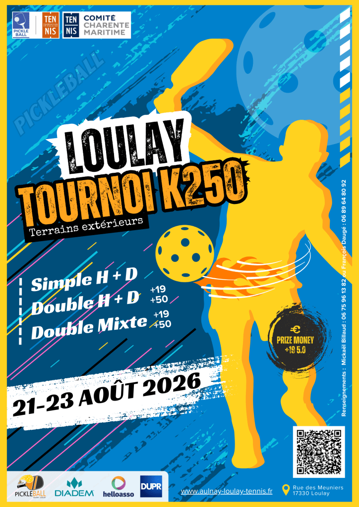 Du 21 au 23 Août 2026, sur le pôle de Loulay (17), retrouvez nous pour l’Open k250 Pickleball de Loulay en Charente-Maritime, tournoi majeur sur le circuit Français et homologué par la Fédération Française de Tennis.